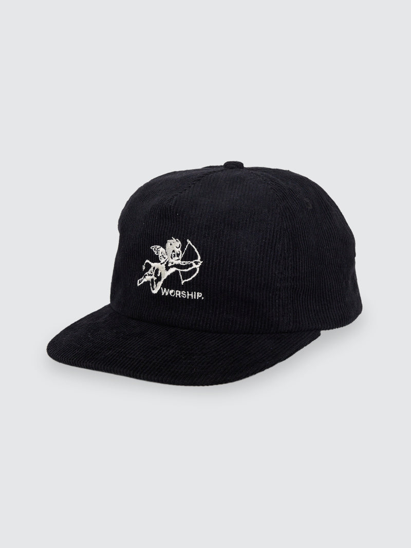 - The Cherub Cord Hat in Black keeps it classic with a touch of Worship attitude. Crafted from 11-wale cotton corduroy, this 5-panel cap brings texture and depth to everyday rotation. The cherub embroidery front and centre adds a bold focal point, while the back strap closure with a branded metal clasp ensures an easy, adjustable fit. Finished in deep black for maximum versatility, this cord hat is a staple headwear accessory to tie any street fit together.